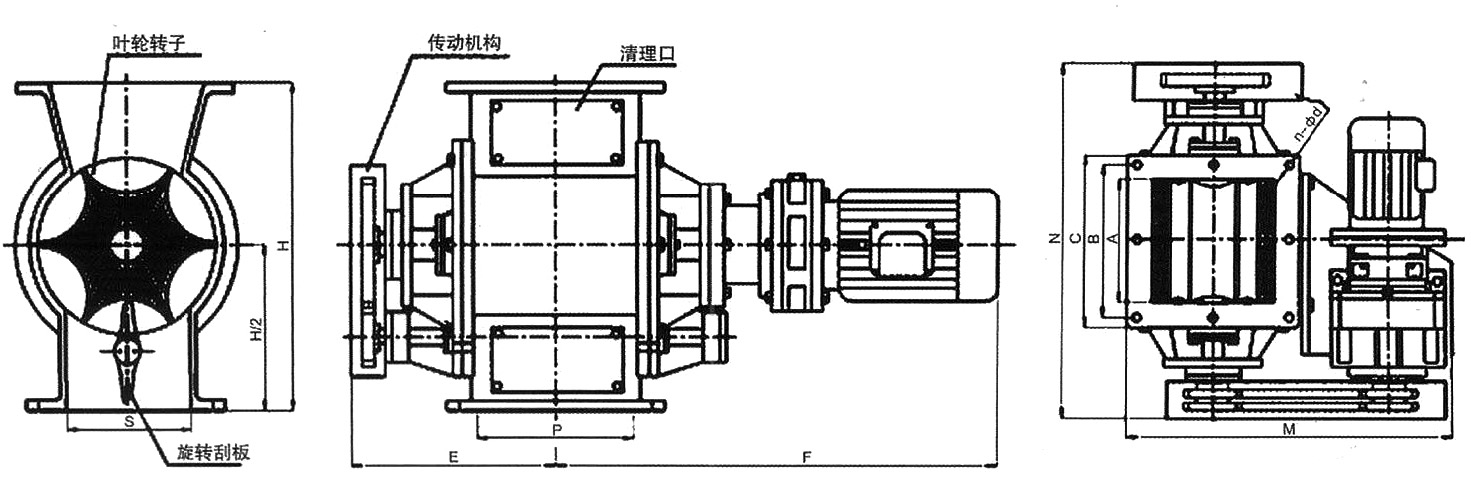 對(duì)于由于潮濕高水分黏附的粉粒料和由于靜電易附著流動(dòng)性差的粉粒料,非常容易架橋或粘附填充在旋轉(zhuǎn)閥的葉片間空腔中不脫落排卸下來(lái),將葉子空腔“糊”住,給氣流輸送和供料器操作帶來(lái)很大困難。本公司提供的刮落式旋轉(zhuǎn)供料閥,其特點(diǎn)是采用圓弧淺腔葉輪和一個(gè)能隨之轉(zhuǎn)動(dòng)的刮板,旋轉(zhuǎn)的刮板能將附著在葉片上的料粒掛落清除,能解決粉粒料在葉片上粘接的問(wèn)題。使定量供料和排料更加順暢,比較適用于容易導(dǎo)致堵塞的粉粒體,能提供150-450mm的各種尺寸的方形和圓形口徑。